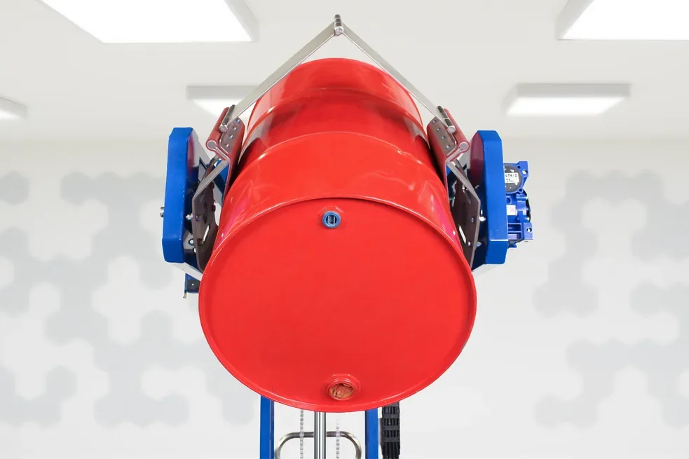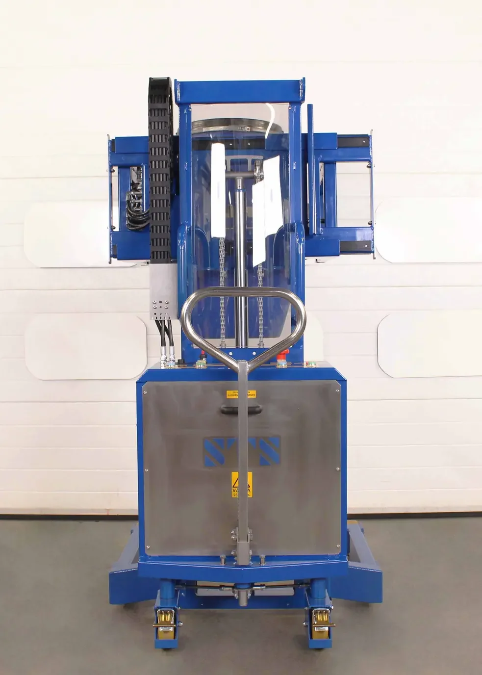 Unlike a banded drum tipping model, this unit has a greater level of powered functionality. Operators wheel the unit towards a drum (located on the floor or the corner of a pallet), clamp the pads around the drum and then lift and tip the contents into a process vessel or secondary container. Powered functions reduce the need for manual interaction with the drum, this is beneficial in saving time and thus improves overall manufacturing cycle times.