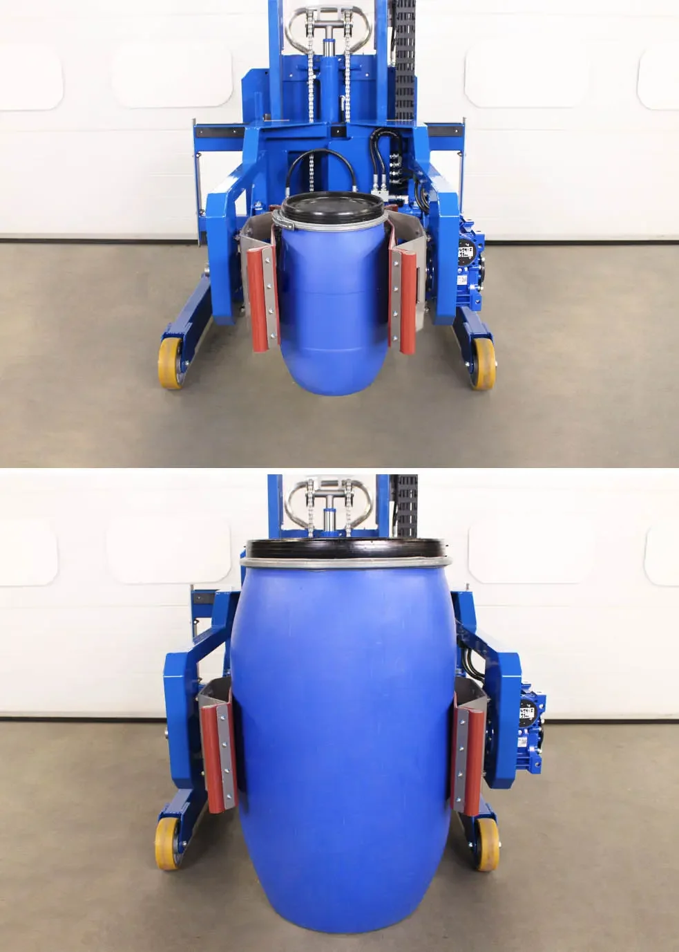 Designed to be as versatile as possible, this power-clamp model can handle a wide range of drum types and sizes. The clamping pads can be provided for handling drums and barrels with a diameter range of between 11” (280mm) and 24.” (610mm). The system has been designed to handle drums of up to 39.37” (1000mm) in height; this covers the majority of drum types used in the market.