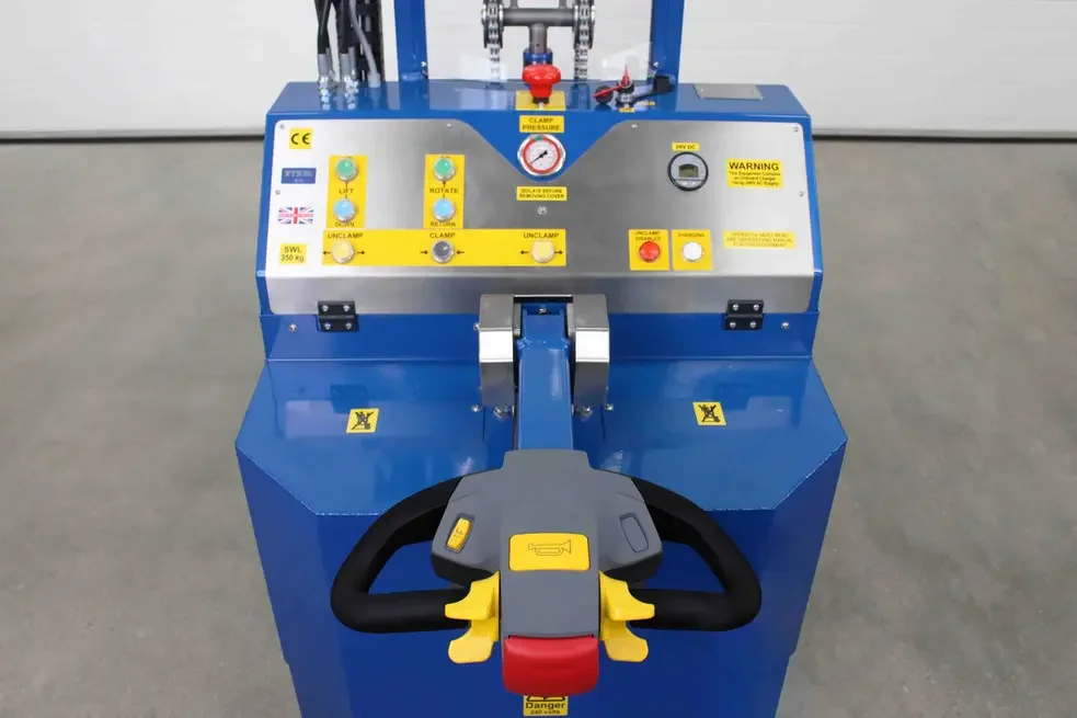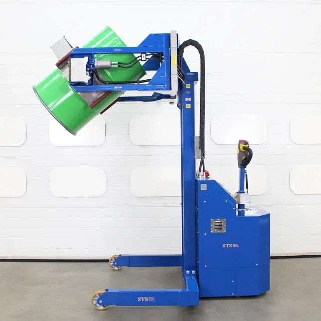 Unlike a banded drum tipping model, this unit has a greater level of powered functionality. Operators wheel the unit towards a drum (located on the floor or the corner of a pallet), clamp the pads around the drum and then lift and tip the contents into a process vessel or secondary container. Powered functions reduce the need for manual interaction with the drum, this is beneficial in saving time and thus improves overall manufacturing cycle times.