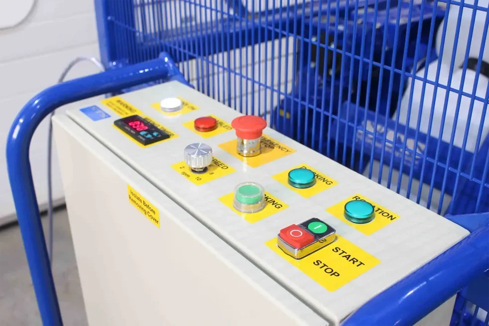This jerrycan mixer features an electric control panel on the side of the unit. The following controls are available via the panel: start/stop, mix timer, variable RPM, docking function and LED-light indicators. Users can configure the jerrycan mixer to suit their requirements, once they press start the mixer will rotate for the set duration. A home function button returns the stack of jerrycans to the vertical orientation ready for unloading.