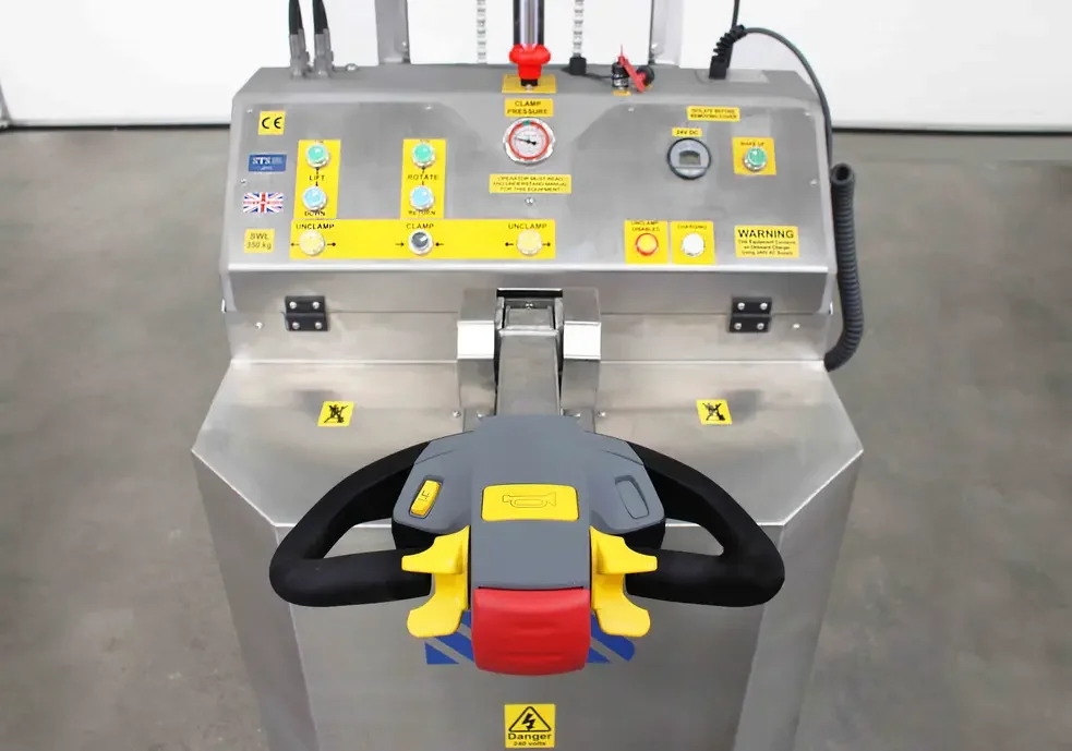 Suitable for safe areas, this fully-powered drum tipper makes use of an onboard battery bank along with two DC electric motors; one for drive and one for clamp/lift/rotation. When the unit is not in use operators connect a mains power lead to the built-in charger to ensure the unit remains fully charged.