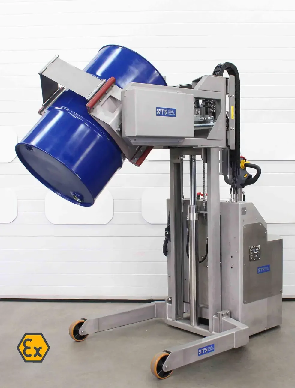 As experts in the field, we have assisted a variety of manufacturing sectors with their hazardous drum-handling processes. Our power-drive pneumatic-hydraulic drum rotators can be supplied ATEX and UKEX compliant, suitable for use in Zone 1, 2, 21 and 22 environments.